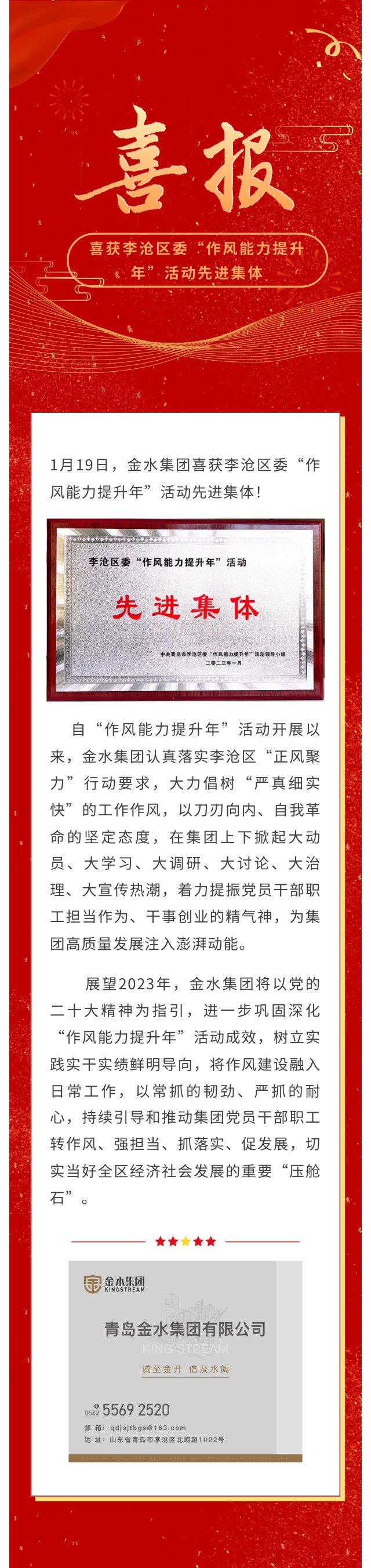 喜报!金水集团荣获 李沧区委“作风能力提升年”活动先进集体